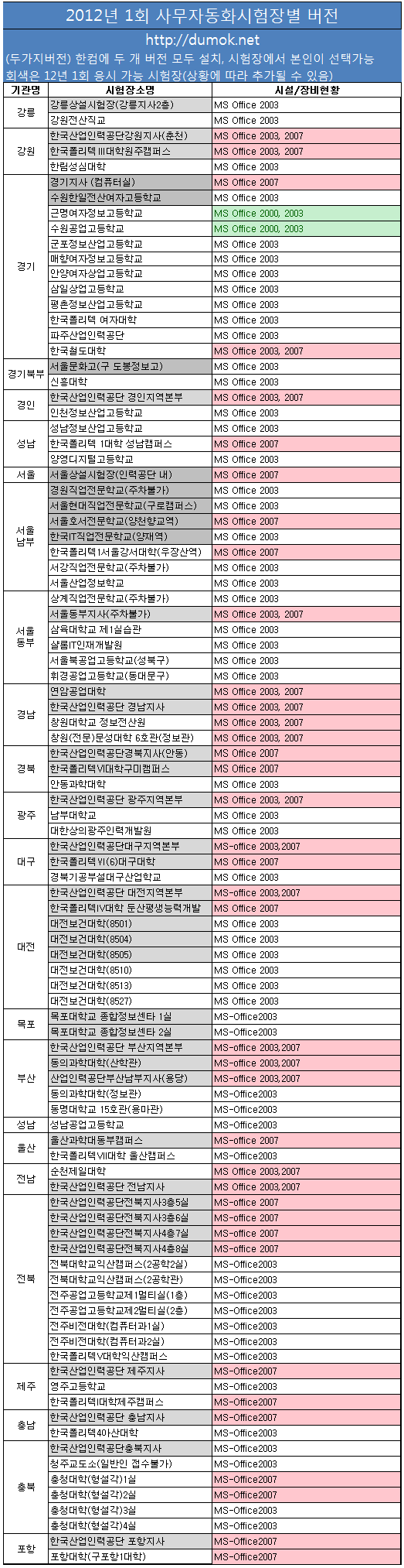 아래 표에서 회색 부분이 2012년 1회 시험 가능 시험장입니다